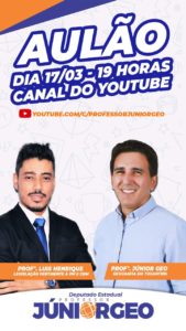 Na próxima quarta-feira, 17, o professor Júnior Geo realizará um aulão de Geografia do Tocantins, juntamente com o professor Luís Henrique, que ministrará uma aula sobre Legislação com dicas para os concursos da Polícia Militar e do Corpo de Bombeiros. O aulão acontecerá por meio do canal do Youtube do Professor Júnior Geo, a partir das 19 horas.