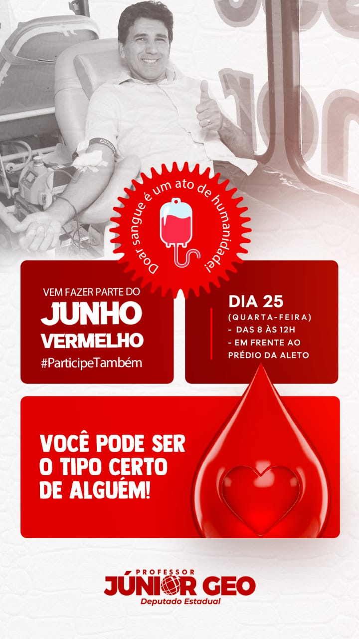 Doador assíduo de sangue há vários anos, o deputado estadual Professor Júnior Geo (PSDB), em parceria com a Assembleia Legislativa do Tocantins (Aleto) e o Hemocentro, realizam o “Junho Vermelho”, convidando servidores da Aleto e população em geral, para a doação de sangue. O ônibus da Hemorrede estará na porta da Casa de Leis, nesta quarta-feira, dia 25 de junho, das 8 às 12 horas, realizando as coletas.